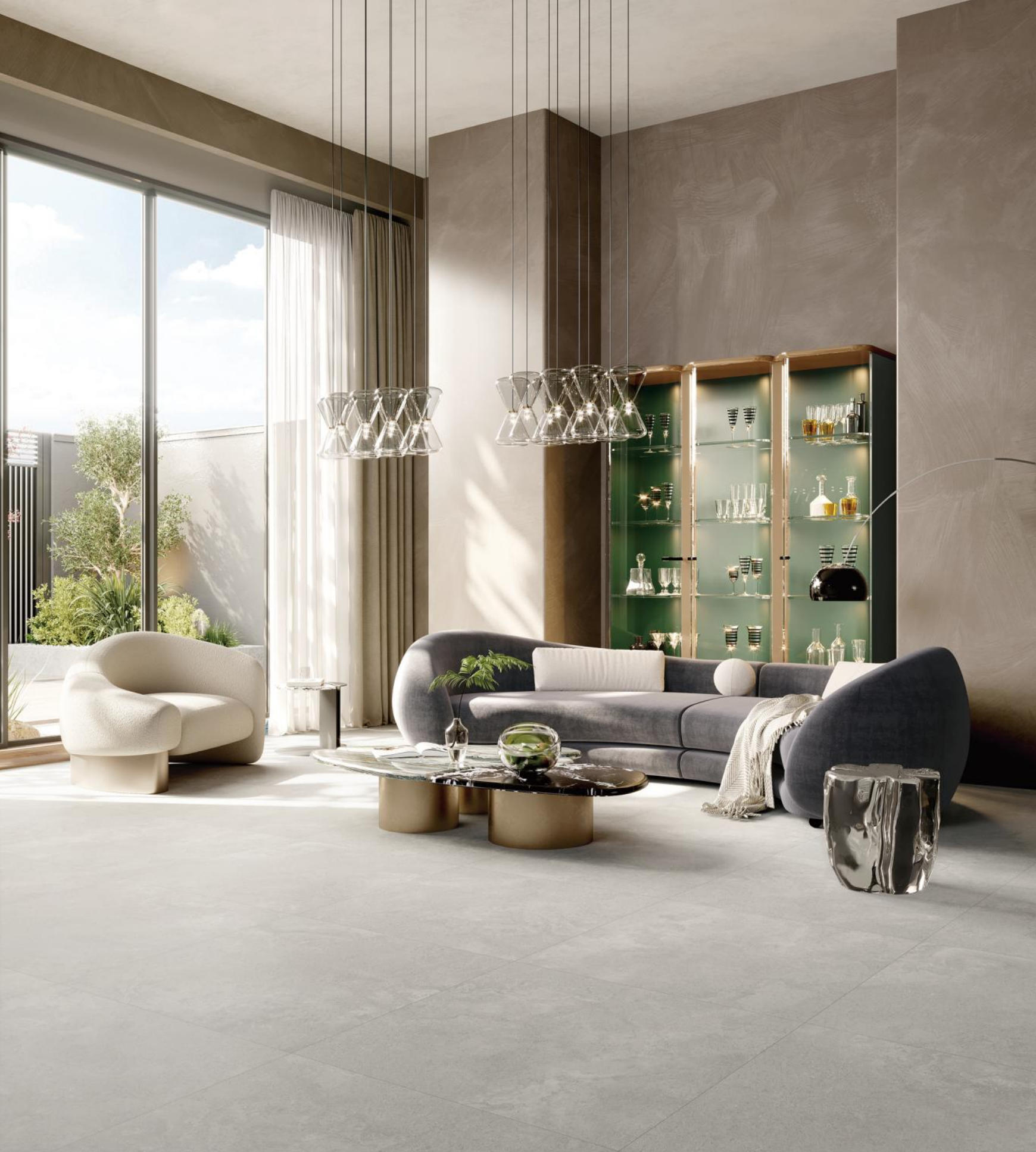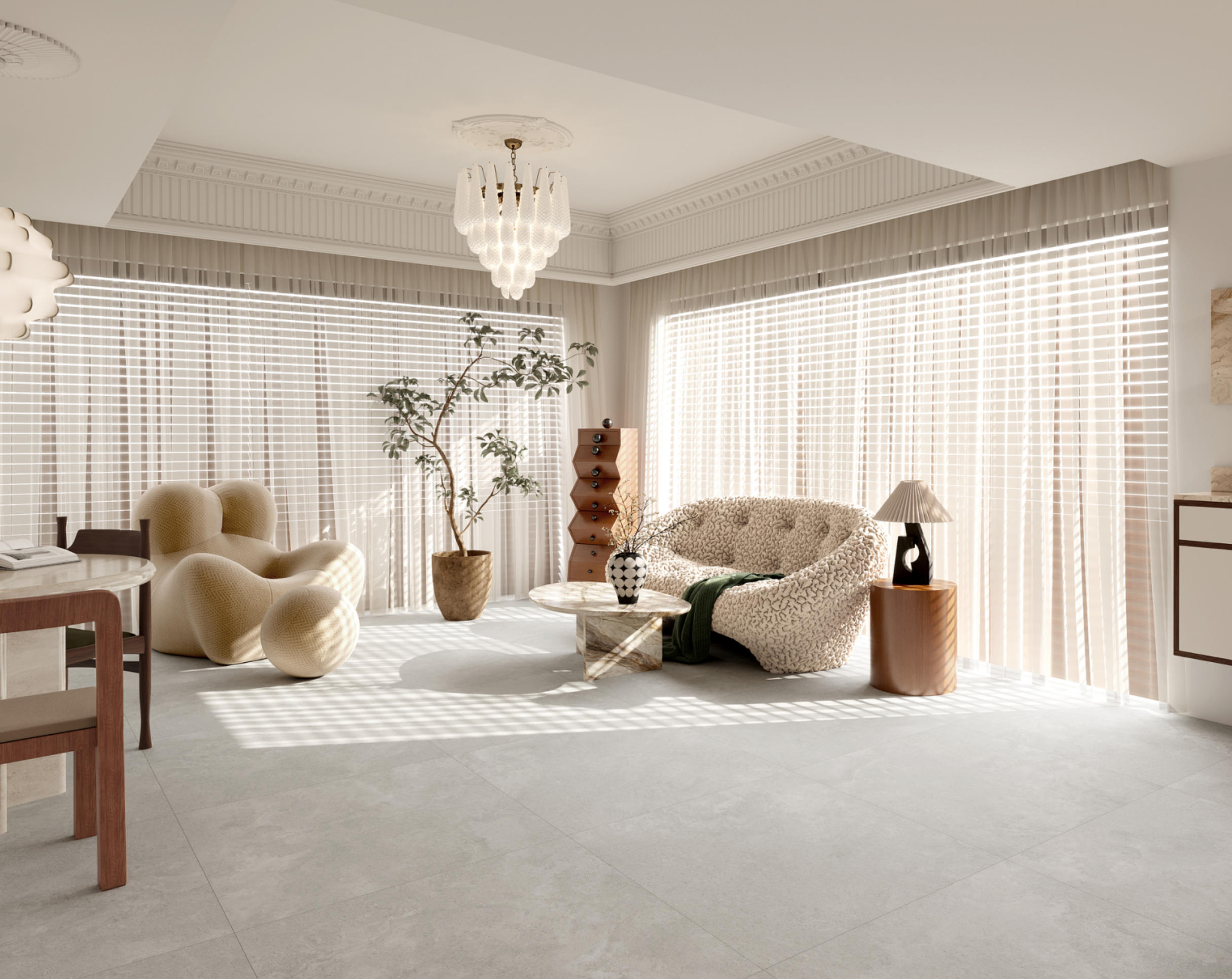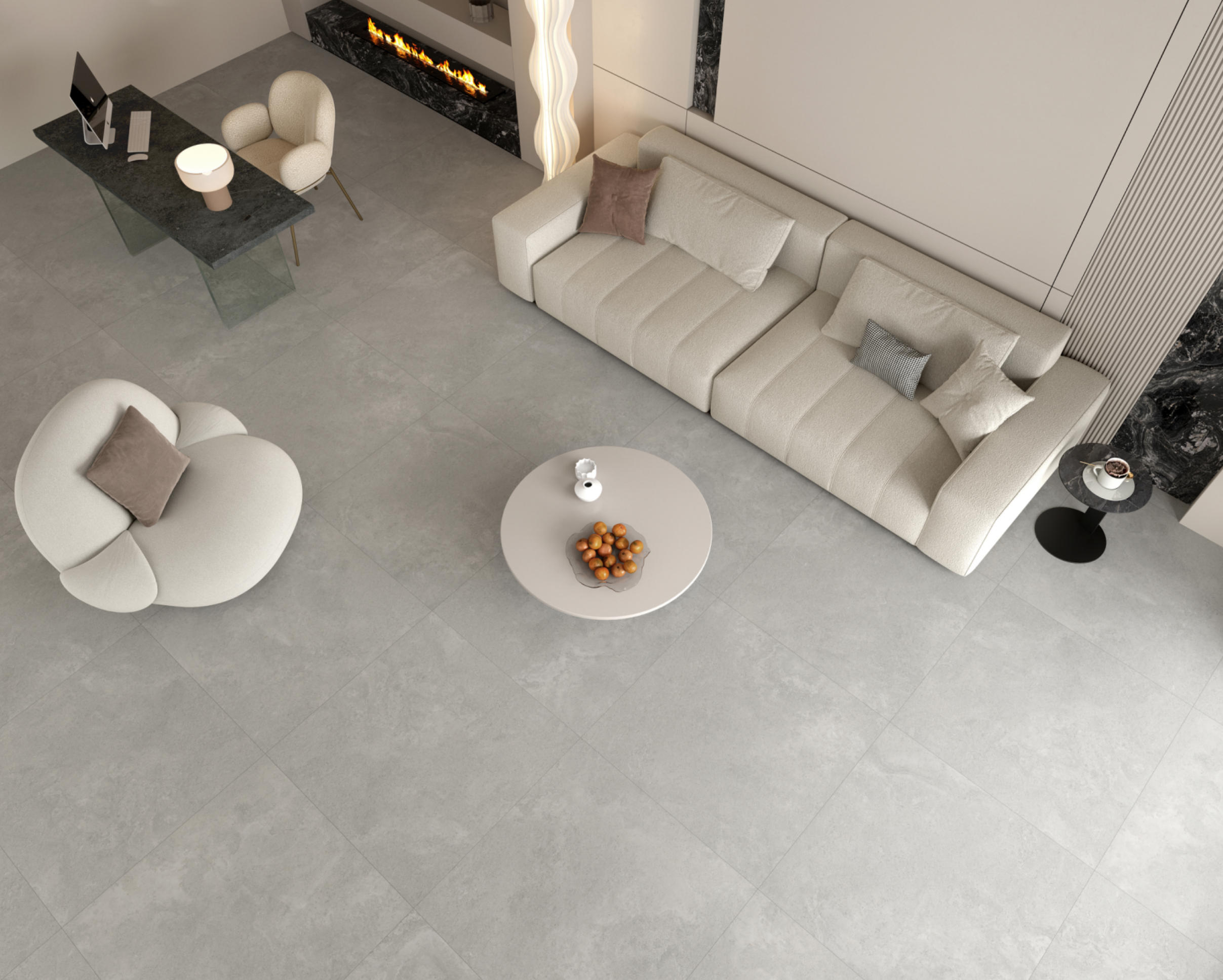 獨特時尚的米杏色調,變幻莫測的漸變紋理流動,彷如歲月的雕琢,給空間帶來連貫、完整、延伸的無垠視界。