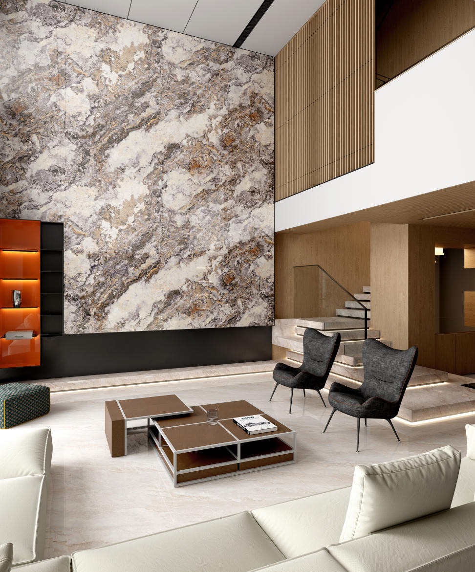 靈感擷取自深海珊瑚的瑰麗形態(tài),將其生命的動(dòng)態(tài)之美于磚面蔓延綻放。褐、咖、灰、棕交織成獨(dú)特藝術(shù)色譜,紋理如珊瑚叢林般自在簇?fù)?,亦如呼吸般自然舒展,蘊(yùn)藏著深海的生命律動(dòng)。